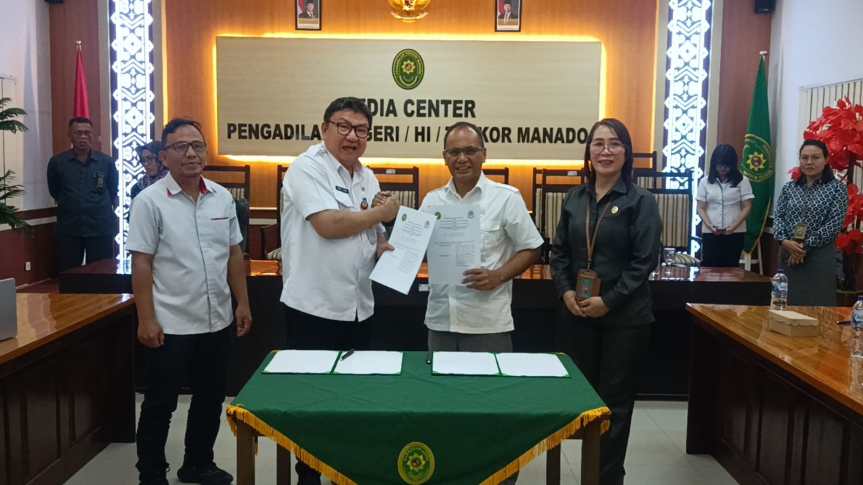 SULUTNEWSTV.com, MANADO – Pengadilan Negeri (PN) Manado bersama Dinas Kependudukan dan Pencatatan Sipil (Disdukcapil) Kota Manado melaksanakan kegiatan Penandatanganan Perjanjian Kerja Sama (PKS) dan Sosialisasi Aplikasi Pengiriman Salinan Putusan yang berkaitan dengan administrasi kependudukan dan pencatatan sipil. Kegiatan ini digelar di Media Center Pengadilan Negeri Manado.