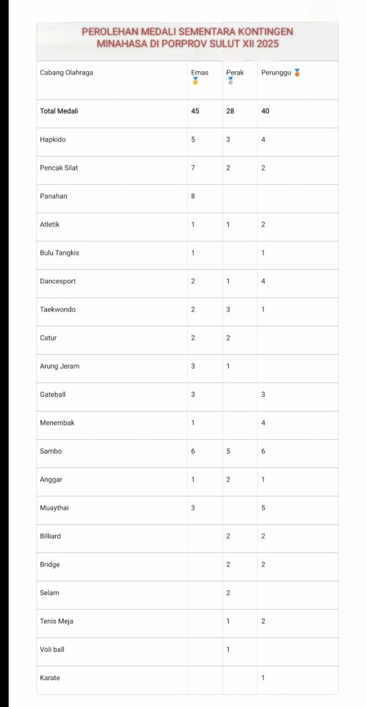 Dengan sisa pertandingan yang masih berlangsung, kontingen Minahasa tetap menargetkan tambahan medali dan menjaga posisi sebagai salah satu kontingen terkuat pada PORPROV XII Sulawesi Utara 2025.