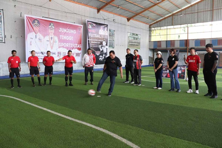 Minahasa – Bupati Minahasa Robby DondokambeySSi MAP (RD) bersama Ketua TP-PKK Minahasa Martina Dondokambey Lengkong SE (MWL) menghadiri sekaligus membuka secara resmi Turnamen Futsal Bupati dan Wakil Bupati Minahasa Cup, Sabtu (29/11/2025). Kegiatan ini digelar di Lapangan Futsal Wawalintouan dan berlangsung dengan antusiasme tinggi dari masyarakat.