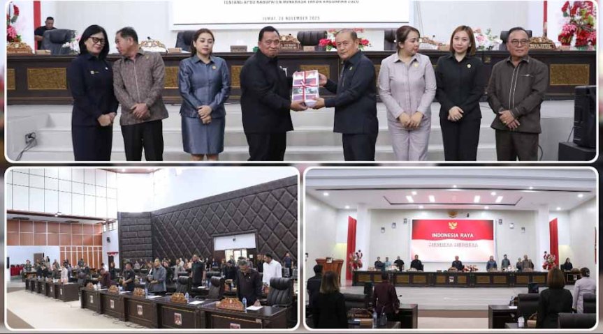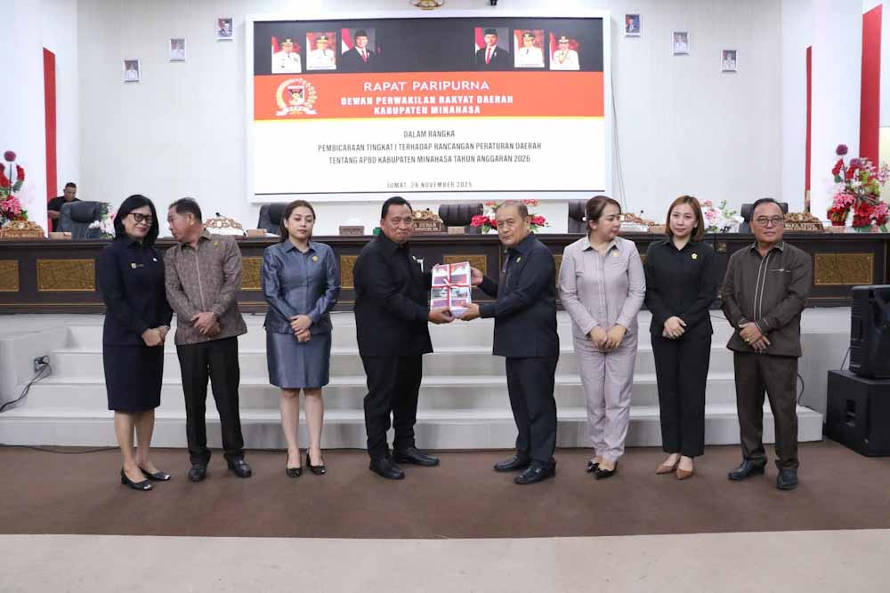 Nota pengantar Pembicaraan Tingkat I terhadap Rancangan Peraturan Daerah (Raperda) tentang APBD 2026 diterima DPRD dalam Rapat Paripurna, Jumat (28/11/2025) di Ruang Sidang DPRD Minahasa.