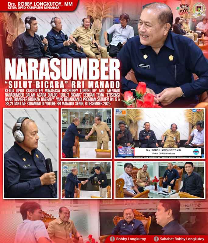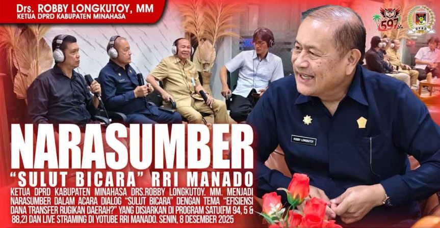 MANADO — Ketua DPRD Kabupaten Minahasa, Drs. Robby Longkutoy, MM, tampil sebagai narasumber dalam program dialog publik “SULUT BICARA” dengan tema “Efisiensi Dana Transfer Rugikan Daerah”, yang disiarkan melalui SatuFM 94,5 – 88,2 dan Live Streaming YouTube RRI Manado, Senin (8/12/2025).