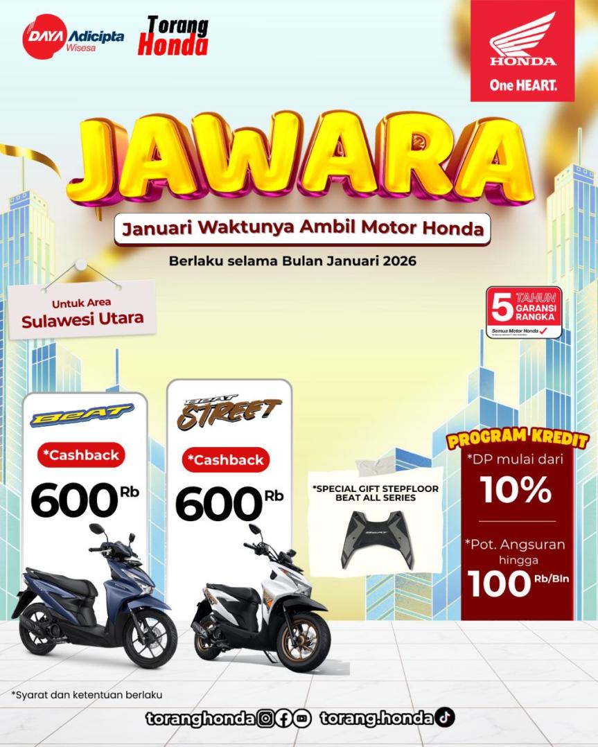 SULUTNEWSTV.com, MANADO – PT Daya Adicipta Wisesa (DAW) menghadirkan Program JAWARA Honda (Januari Waktunya Ambil Motor Honda) dengan menawarkan cashback hingga Rp600 ribu bagi konsumen sepeda motor Honda.