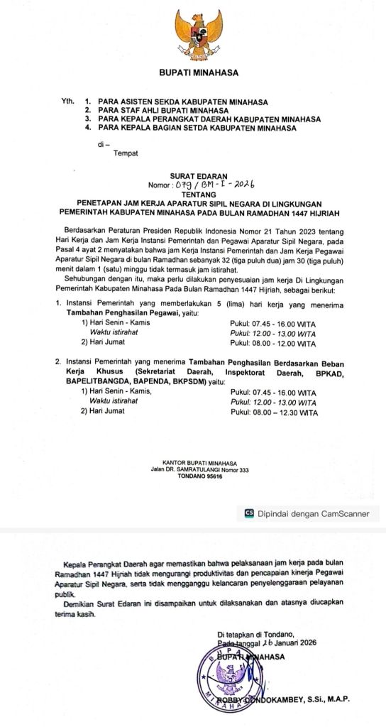 Minahasa – Pemerintah Kabupaten Minahasa dibawah kepemimpinan Bupati Dr. Robby Dondokambey, SSi, MAP dan Wakil Bupati Vanda Sarundajang, SS, menetapkan penyesuaian jam kerja bagi Aparatur Sipil Negara (ASN) selama bulan Ramadan 1447 Hijriah atau tahun 2026.